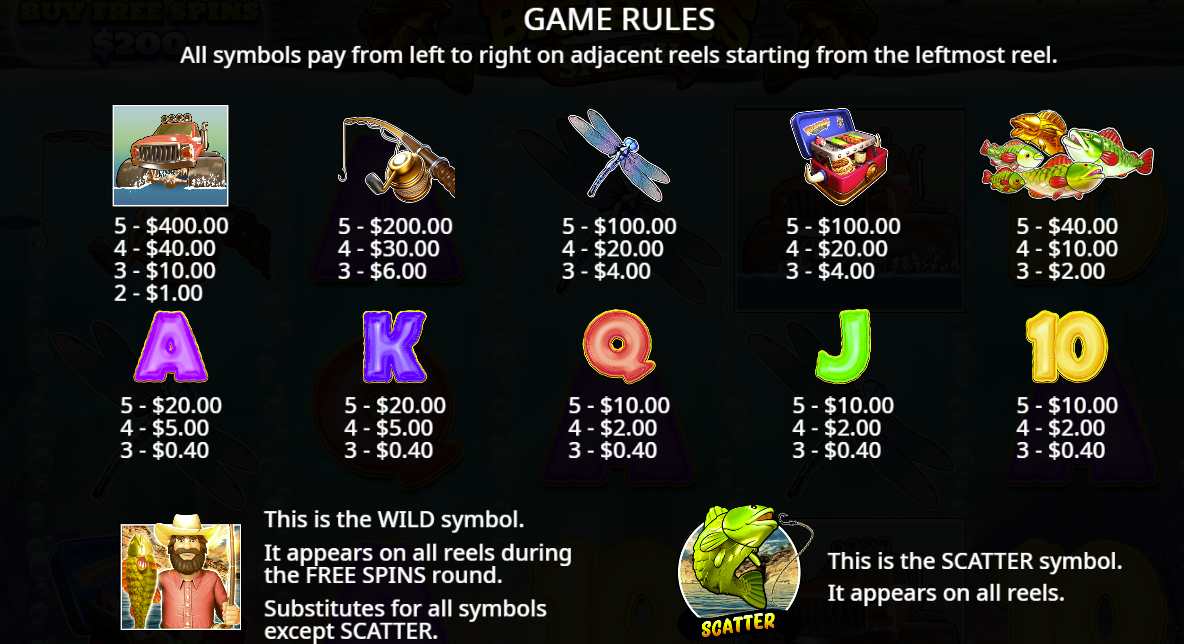 - Scatter Symbol Hooked Bass / Fish Scatter: Landing 3 or more scatters anywhere triggers the Free Spins feature. :contentReference[oaicite:10]{index=10}
