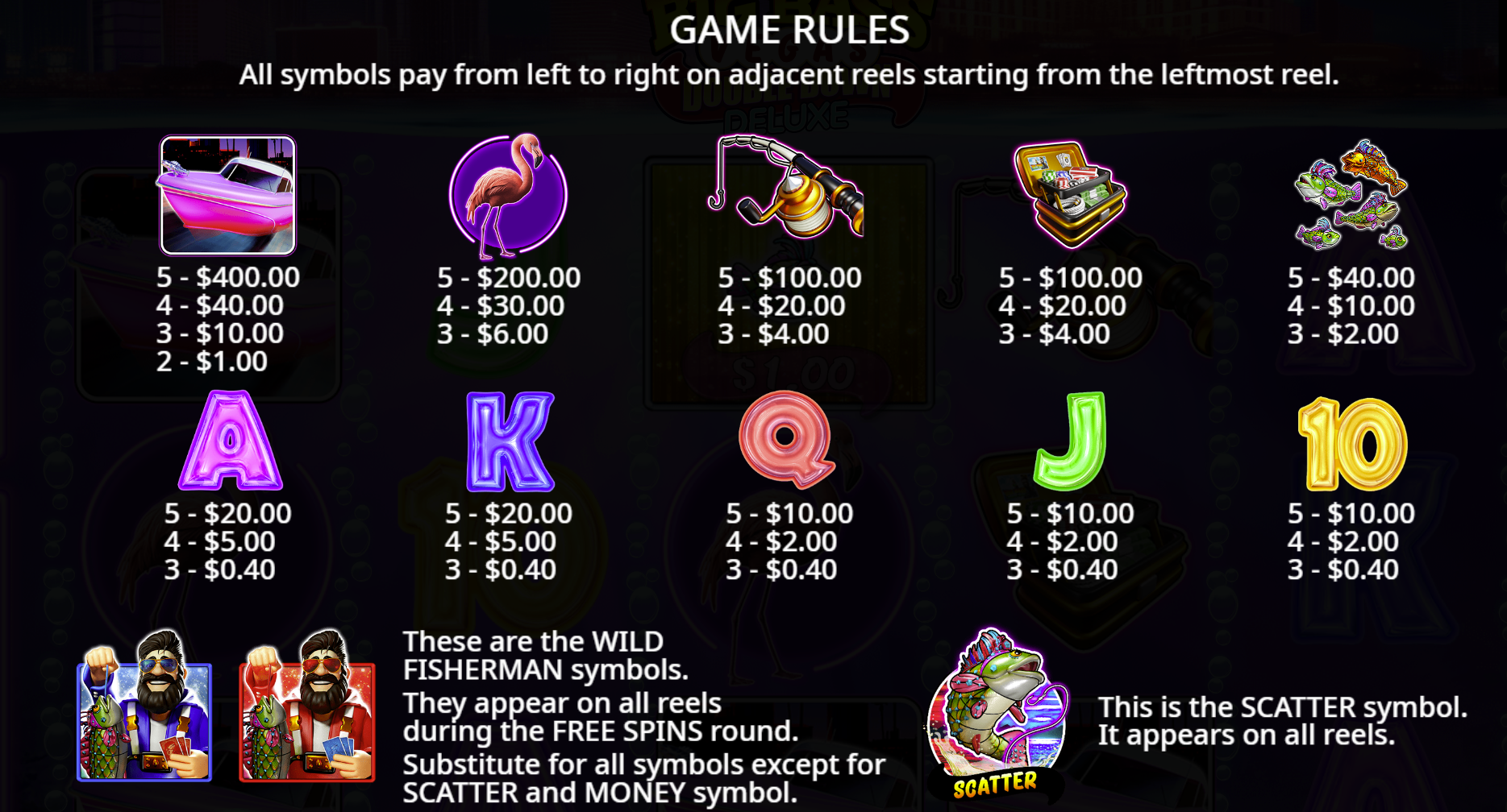 - Money Symbols: Fish (or fish-themed) symbols can randomly appear with money values ranging from low multiples up to a potential large multiplier (theoretically up to 5,000? bet) when collected by a wild fisherman during bonus spins. :contentReference[oaicite:9]{index=9}